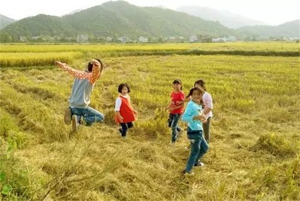与忙碌的大人们相反,孩子们在收割过的稻田里,欢快地跳来跳去,无忧无虑地嬉戏、玩耍,享受着自己的乐趣。