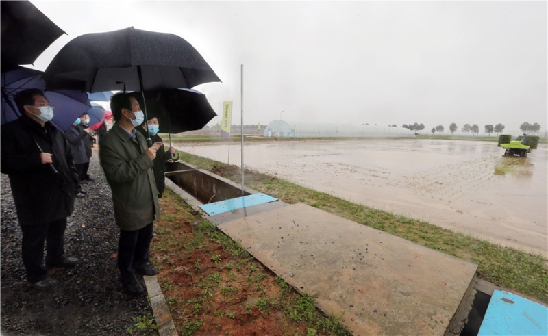 (许达哲观看中联重科智慧农机产业园新下线的高速有序抛秧机演示抛秧作业)