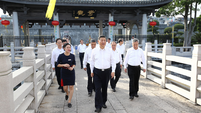 习近平来到二层檐廊,举目远眺,韩江水阔,长桥卧波。在听取广济楼历史和古城修复保护情况汇报后,习近平强调,包括广济桥、广济楼在内的潮州古城比较完好地保留了下来,实属难得,弥足珍贵。在改造老城、开发新城过程中,要保护好城市历史文化遗存,延续城市文脉,使历史和当代相得益彰。