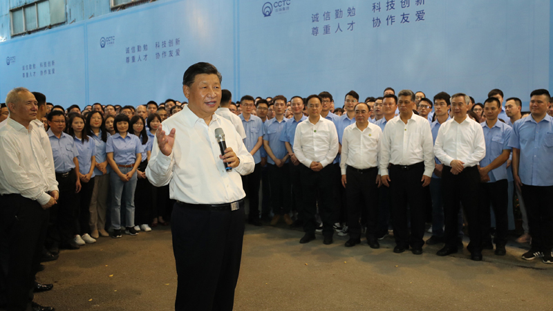 10月12日至13日,中共中央总书记、国家主席、中央军委主席习近平在广东考察。这是12日下午,习近平在潮州市潮州三环(集团)股份有限公司生产车间考察。新华社记者 王晔 摄