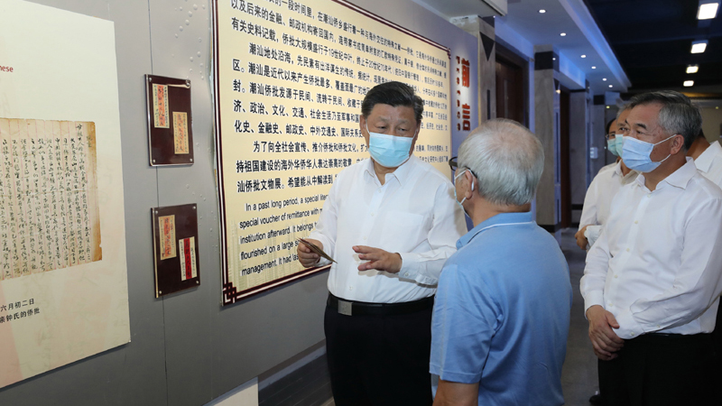 随后,习近平参观了具有潮汕侨乡特色的侨批文物馆。过去很长一段时间,海外华侨通过民间渠道将连带家书或简单附言的汇款凭证寄回国内,这些“侨批”成为研究近代华侨史的珍贵档案。习近平听取侨批历史和潮汕华侨文化介绍。他强调,“侨批”记载了老一辈海外侨胞艰难的创业史和浓厚的家国情怀,也是中华民族讲信誉、守承诺的重要体现。要保护好这些“侨批”文物,加强研究,教育引导人们不忘近代我国经历的屈辱史和老一辈侨胞艰难的创业史,并推动全社会加强诚信建设。潮汕地区是我国著名侨乡。汕头经济特区要根据新的实际做好“侨”的文章,加强海外华侨工作,引导和激励他们在支持和参与祖国现代化建设、弘扬中华文化、促进祖国和平统一、密切中外交流合作等方面发挥更大作用。