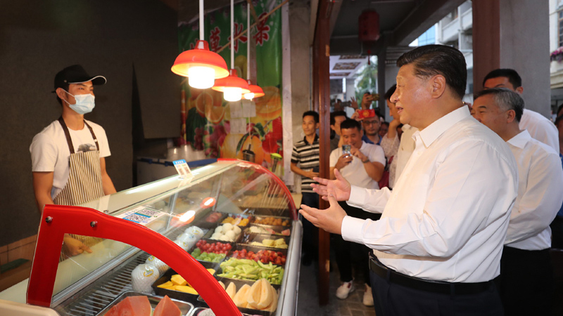 10月12日至13日,中共中央总书记、国家主席、中央军委主席习近平在广东考察。这是13日下午,习近平在汕头市小公园开埠区,同商铺店员亲切交流,了解复商复市和常态化疫情防控情况。新华社记者 鞠鹏 摄