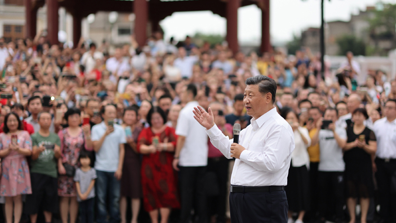当地群众和游客们见到总书记来了,争相围拢上来向总书记问好。习近平祝大家生活愉快、健康幸福。他指出,我国改革开放和经济特区的建设同大批心系乡梓、心系祖国的华侨是分不开的。我们即将全面建成小康社会、开启全面建设社会主义现代化国家新征程,向第二个百年奋斗目标进军。到本世纪中叶把我国建成富强民主文明和谐美丽的社会主义现代化强国,是海内外全体中华儿女的共同心愿。今年是经济特区建立40周年,我特地来汕头经济特区考察调研,就是要向国内外宣示,中国共产党领导中国人民将坚定不移走改革开放道路,奋发有为推进社会主义现代化建设,锲而不舍实现中华民族伟大复兴的中国梦。希望乡亲们携手努力,共同奋斗!