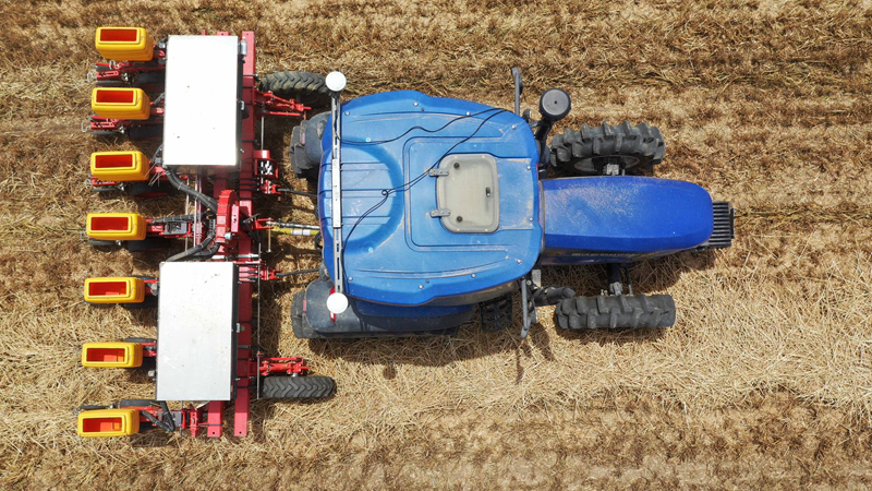 在河南省邓州市小杨营镇安众村,加装有北斗导航系统的拖拉机在无人驾驶状态下播种(2020年5月26日摄,无人机照片)。新华社记者 冯大鹏 摄