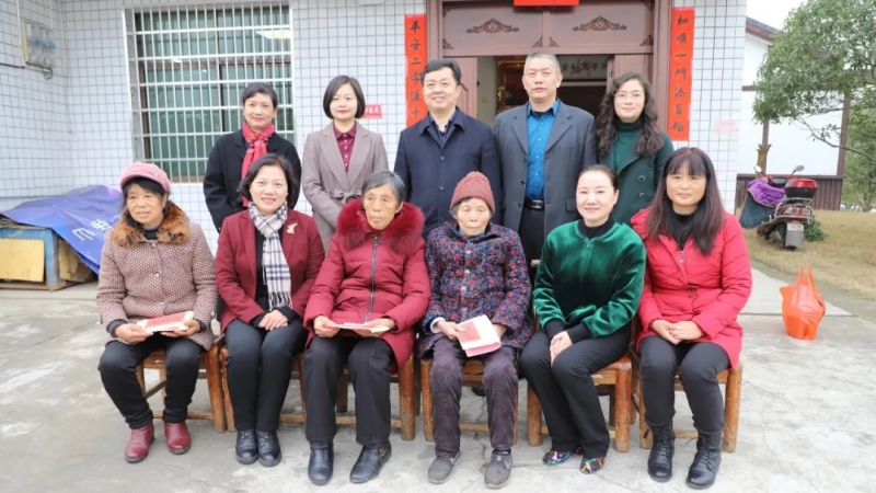 最后,姜欣一行和三位老人、村妇联主席愉快地合影。