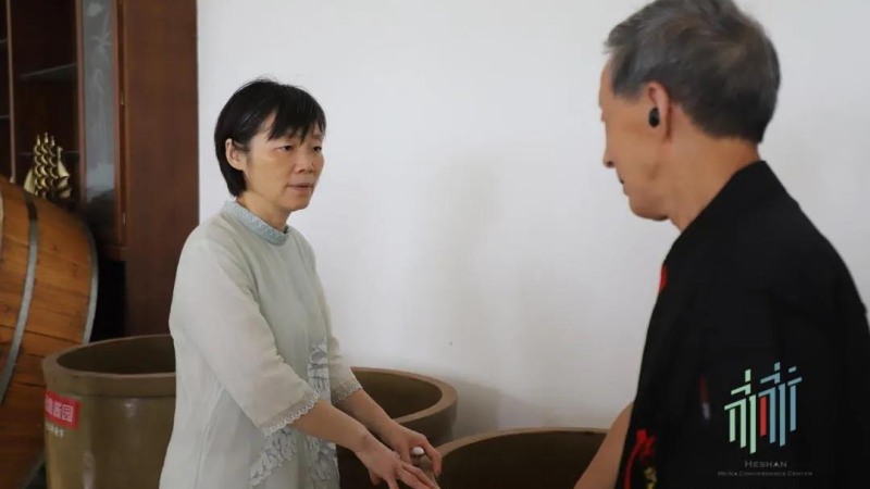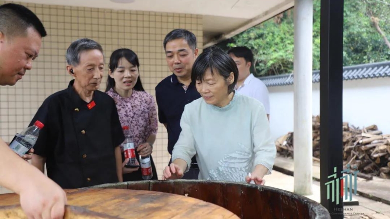 杨丽萍一行来到赫山区会龙山街道仙蜂岭村,实地察看了益阳冠鑫农业开发有限公司设立的传统酿造工艺作坊,详细了解传统工艺的历史渊源、生产原料、制作流程及品牌产品等情况,听取公司下阶段传承和发扬传统工艺的目标计划与具体措施。