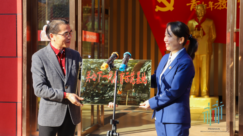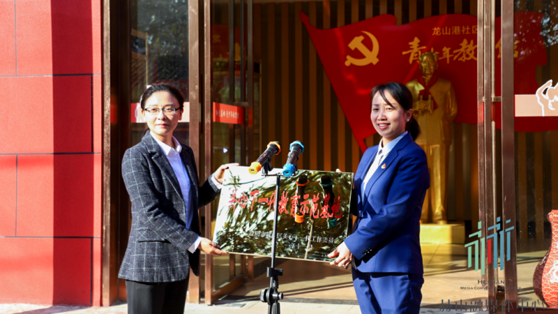仪式现场,胡国洪、王琛分别向龙山港社区授予市、区两级“关心下一代教育示范基地”牌匾。