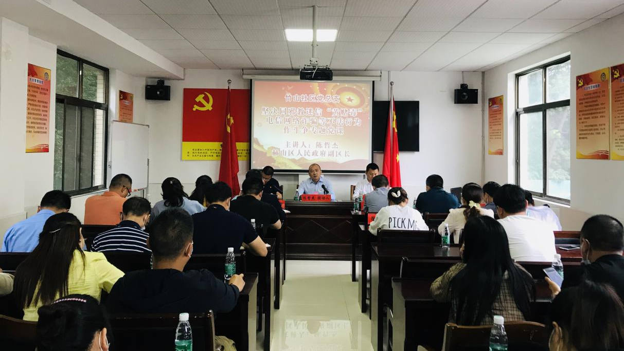 5月26日,区政府党组成员、副区长陈哲杰深入金银山街道竹山社区,围绕“坚决同邪教迷信、‘黄赌毒’、电信网络诈骗等不法行为作斗争”主题,为基层党员干部讲授专题党课,并对社区开展专题调研。街道在家党政班子成员、社区办点干部和部分党员聆听了党课。会议由街道党工委副书记、办事处主任徐亮主持。