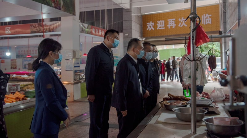 在赫山南市场,马文才仔细询问查看重点人员核酸检测和常态化防控措施落实情况,现场指出存在问题,要求进一步抓好大型商超、农贸市场等重点场所防控,加大宣传引导力度,落实好戴口罩、测体温、扫场所码等防控措施。