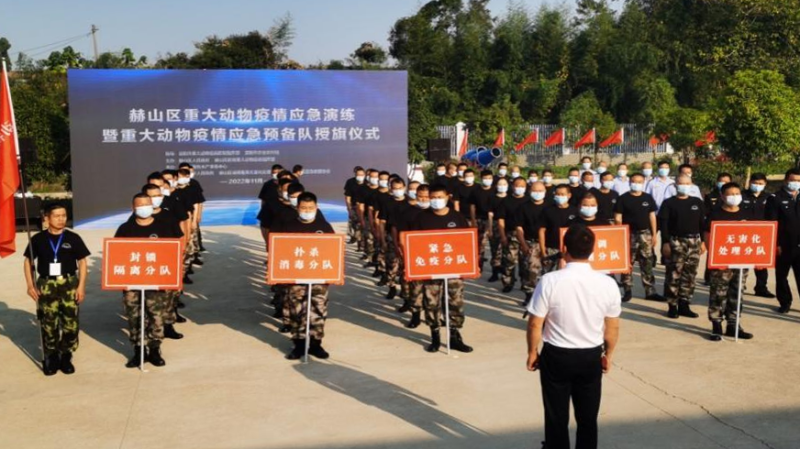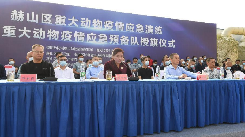 2022年11月11日,赫山区在诚铸无害化处理公司举行重大动物疫情应急演练暨应急预备队授旗仪式。省畜牧水产事务中心党组副书记、副主任邓云波、市农业农村局副局长李小阳现场指导并讲话,副区长蔡丽环担任演练现场总指挥,致辞并宣布演练开始。