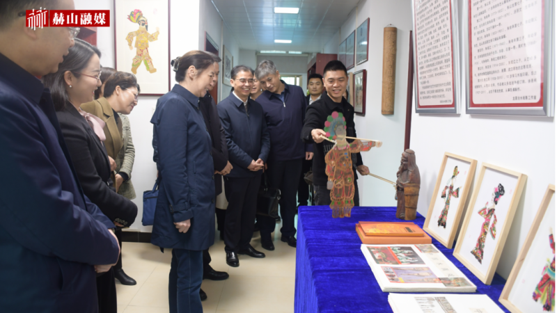 在龙居沧水纸影坊,非遗传承人朱龙现场展示皮影人物翻转摆动等表演,介绍了传承200多年的皮影作品、丰富的演出经历及对皮影事业的追求——将传统影戏充分与时代发展相结合。随后,廖建华一行参观了染色剪纸、凿花剪纸、生肖剪纸、木雕、剪纸食盒等展览作品。朱龙先生对纸影技艺的热爱与钻研,对纸影文化的传承和坚守让调研组一行深表赞叹!
