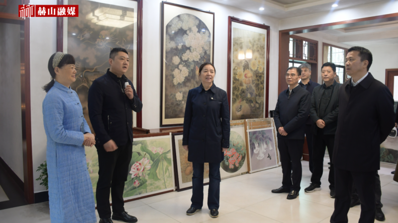 在罗胜利工作室,廖建华一行参观了罗胜利的相关画作,参观过程中,罗胜利的儿子详细地讲解了画作寓意及背后创作的故事,一行人或驻足观赏,或拍照留念,或静静凝望,感受罗胜利勤学苦练、自强不息的奋斗精神。