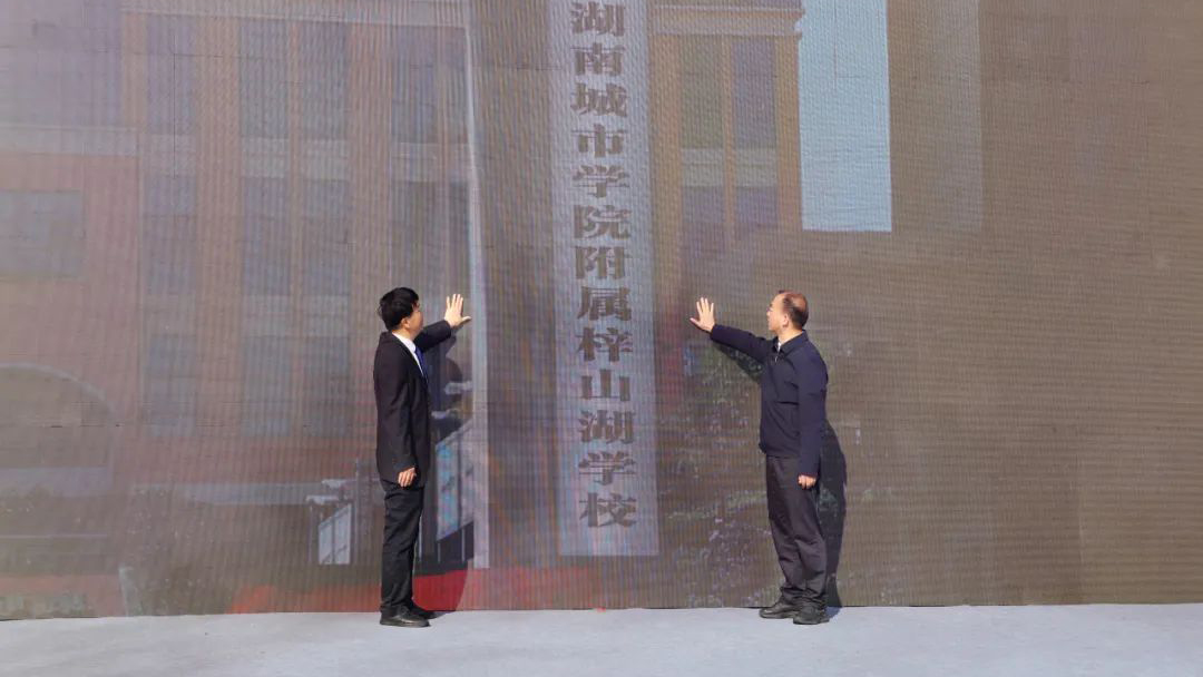 仪式上,湖南城市学院党委书记汤放华、区委书记周卫星为湖南城市学院附属梓山湖学校揭牌;湖南城市学院党委委员、副校长雷存喜与副区长赵嘉喜签订校地共建框架协议书。