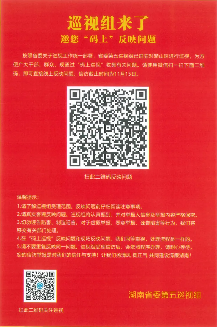 据悉,省委巡视组将在赫山区工作2个月左右,并巡视带巡察区纪委监委机关、组织部门、巡察机构。巡视期间,设专门值班电话:0737—6715561;专门邮政信箱:益阳市赫山区A011号信箱,并公布“码上巡视”微信二维码。省委巡视组受理电话的时间为:工作日上午8∶30—12∶00,下午14∶30—18∶00。省委巡视组受理信访截止时间为11月15日。根据巡视工作条例规定,省委巡视组主要受理反映赫山区领导班子及其成员、下一级党组织领导班子主要负责人和重要岗位领导干部问题的来信来电来访,重点是关于违反政治纪律、组织纪律、廉洁纪律、群众纪律、工作纪律和生活纪律等方面的举报和反映。其他不属于巡视受理范围的信访问题,将按规定由赫山区和有关部门认真处理。