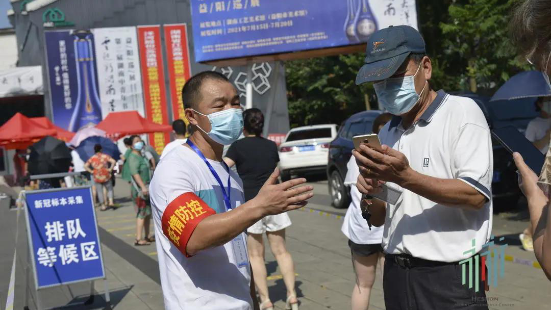 金银山街道秀峰社区创意园,参与核酸检测的群众有序排成两队