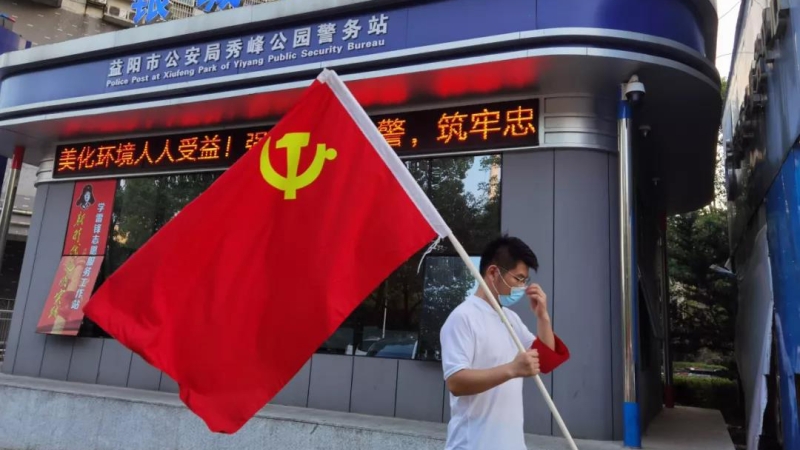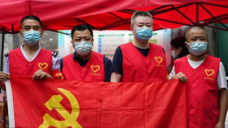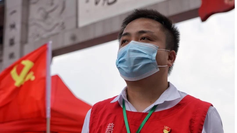6日晚,市委组织部党员干部仍扛着党旗,拿着喇叭走街串巷,为群众普及抗疫知识