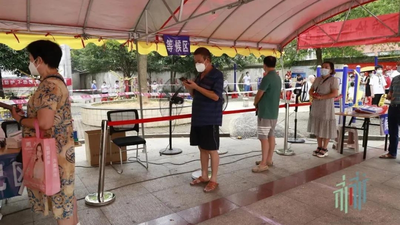 在等候区,工作人员组织居民依次有序排队,保持1米间隔,并督促接种人员佩戴好口罩,进行体温检测和健康码、行程码的查验。然后依序排队经过待检区,在检验区完成登记和取样,从登记到完成取样,人均只需1分钟。