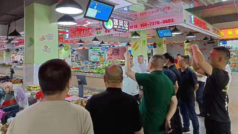 观摩组一行首先听取了富桥智慧农贸市场工作人员对溯源大数据平台、食品快速检测系统的介绍,随后参观了市场蔬菜区、家禽区、熟食区、生鲜肉类区,学习了电子化交易收银台、垃圾分类、公平交易、便民服务等现代化设施建设,并与市场工作人员就智慧农贸市场建设先进经验进行深入交流。