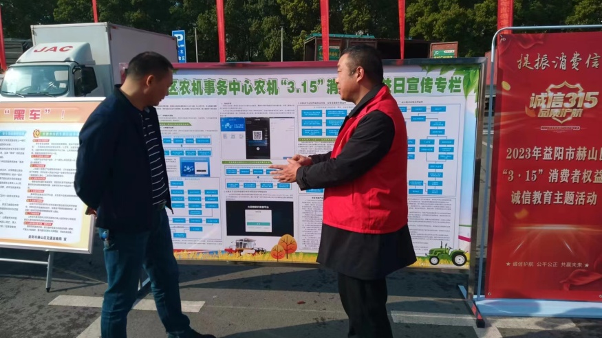 3月15日,赫山区科技专家服务团农机志愿者参加了区委区政府组织的“3•15”消费者权益日活动,农机行业以“稳粮保供、提质护农”为主题,结合农机推广、农机安全等工作大力开展宣传活动。通过设置宣传展板、面对面讲授和发放宣传单等方式,重点宣传《农机购置补贴“三合一”办理操作流程》(农机补贴APP、二维码系统和物联网平台三者合一),《农业机械产品修理、更换、退货责任规定》等,促进消费者正确购买机具,经销商诚信经营。