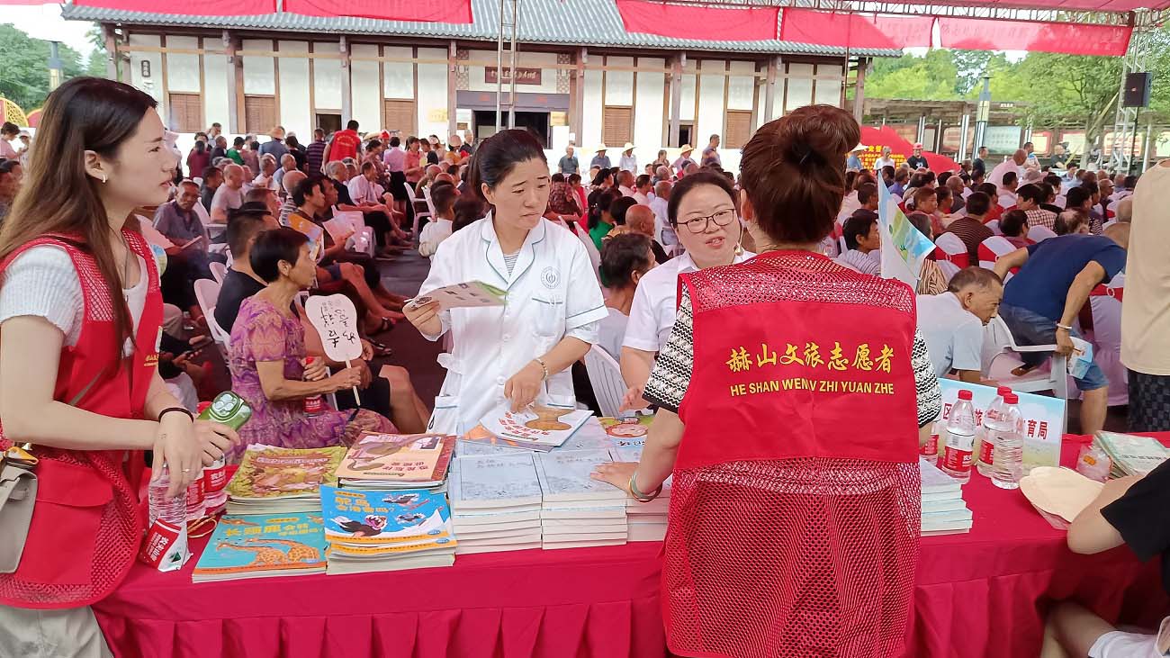 台上,花鼓演艺有限公司的演员们不畏酷暑,精神饱满地为现场群众倾情演绎了《“扫黄打非”不放松》《乡村振兴谱新篇》等精彩剧目。台下,赫山区图书馆馆长王立雄亲自带队为当地群众送书,丰富的图书品种、优秀的图书质量吸引了众多村民,赫山文旅广体局工作人员现场推介了赫山文旅资源及非遗产品,吸引了无数村民驻足。为孙女领书的张大妈开心地说:“这么好的书免费送给我们,国家政策真是越来越好了”。据统计,当日共计送出图书200余册,发放文旅宣传册500余册。