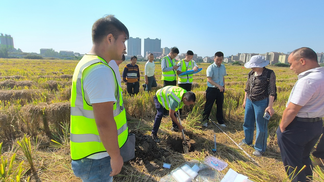 “大家都注意脚下,不要踩踏到标记的样点,否则会造成土壤压实,影响后续观测的数据。”采样现场总技术负责人王飞对田边围观的群众提醒道。同时,外业工作人员迅速将信息化终端、摄录设备、采样工具、样袋、速测仪器、辅助材料等在收割完毕的稻田里铺开,井然有序地按照工作分工开展土壤采样工作,技术专家结合土块特点以及外业采样技术要点不时对采样人员提出意见建议。“今天来参加采样的,将来都是各乡镇采样工作的技术负责人,为保障之后调查采样数据的精确性,我们对你们要求肯定要更加严格。”省土壤肥料研究所研究员聂军接过工作人员手中的尺子,反复确认着样方点的深度是否符合规范要求。