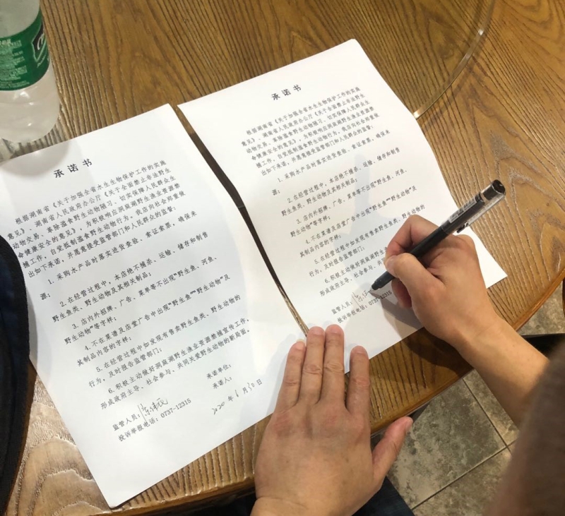 开展整治行动,签订承诺书。街道联合市场监督管理所对辖区内挂有河鱼、河鲜等招牌的餐馆进行全面摸排,要求4家餐馆更换招牌,并与市场内经营水产的20余家商户,签订了禁止非法野生动物交易承诺书。