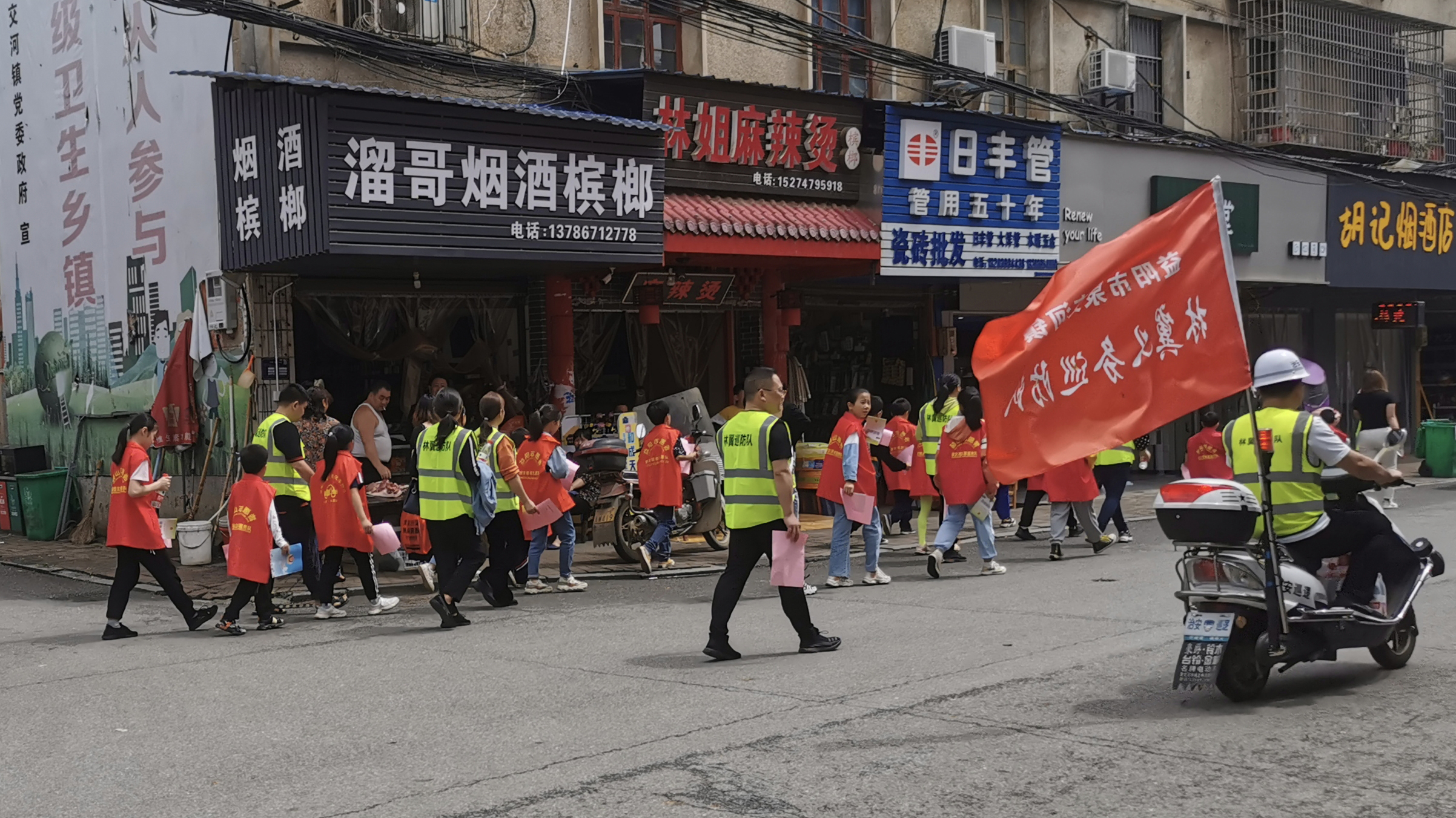 身穿红马甲,臂戴红袖章的20余名青少年志愿者在家长们的带领下,前往人流、车流量集中的农贸市场前的路口进行“交通安全劝导”,劝导摩托车、电动自行车驾驶员佩戴头盔,遵守交通规则,提醒出行群众注意安全,并向行人及沿街门店发放创文创卫宣传手册。