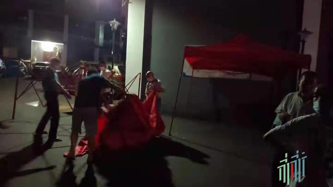“师傅,喝口水吧”“一、二、三!架起来”晚上11点多,赫山街道赫山社区鹏利广场大门外,社区和搭帐篷的师傅正在加班加点,抓紧时间搭建好明天核酸采样的帐篷。