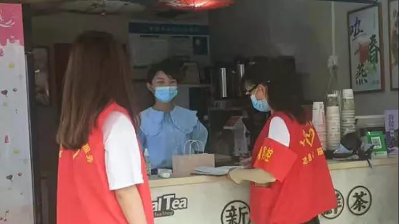 烈日炎炎,返乡大学生志愿者们对辖区内的企业和门店进行上门督察,检查上门人员排查登记信息,帮助其测量体温、核查两码,做好疫情防控工作。