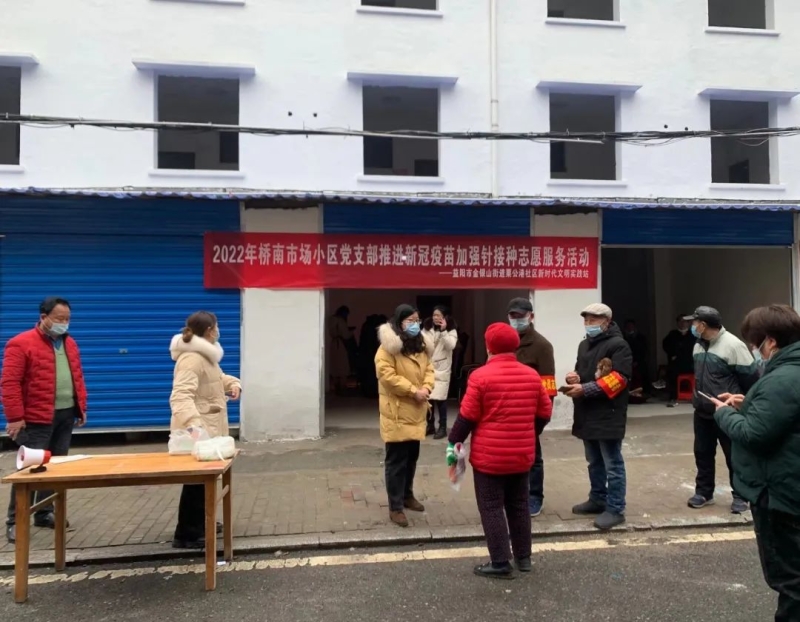 金银山街道粟公港社区通过上门宣传、喇叭广播、网格群、市场门店微信群等渠道广泛宣传动员,于2月23日在桥南市场小区党支部设立了新冠疫苗加强针临时接种点,为桥南市场周边居民开辟接种“绿色通道”。