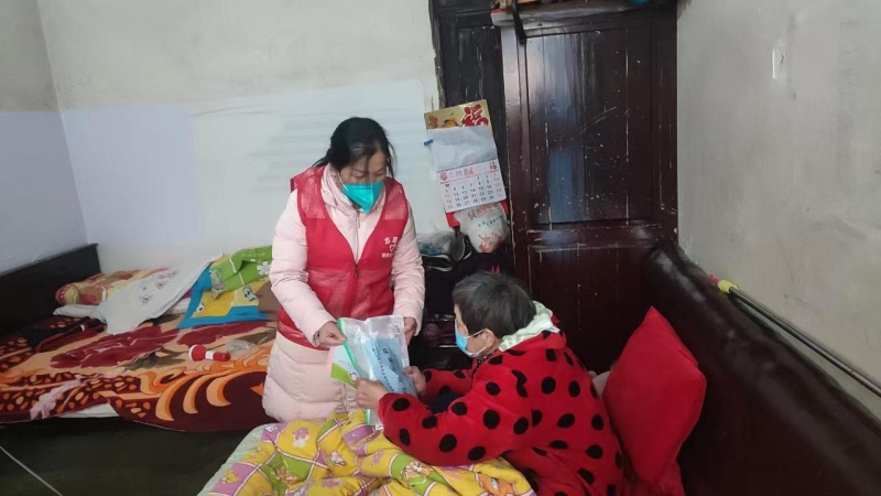 “高娭毑新年好,这是给您准备的“健康防疫包”,这段时间天气也冷,您注意身体,一定做好防护。”1月3日下午,桃花仑街道新时代文明实践所的志愿者来到铁铺岭社区独居老人高娭毑家,将一份爱心满满的防疫物资包送到高娭毑手里,并贴心将药品和抗原检测试剂的使用进行详细解释说明。高娭毑今年82岁,患有糖尿病、高血压等多项疾病,视力模糊,出门极为不便,长期一个人居住。此前,铁铺岭社区新时代文明实践站志愿者通过“敲门行动”对辖区群众进行摸排登记,将高奶奶的个人信息记录在重点人群台账中。