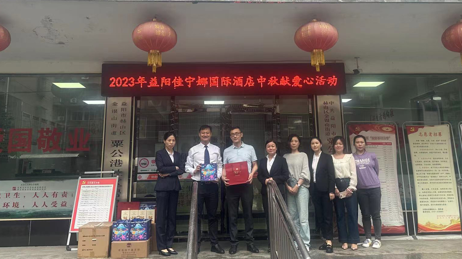 在中秋佳节来临之际,益阳佳宁娜酒店在金银山街道粟公港社区,向联户代表们进行爱心物资捐赠活动。