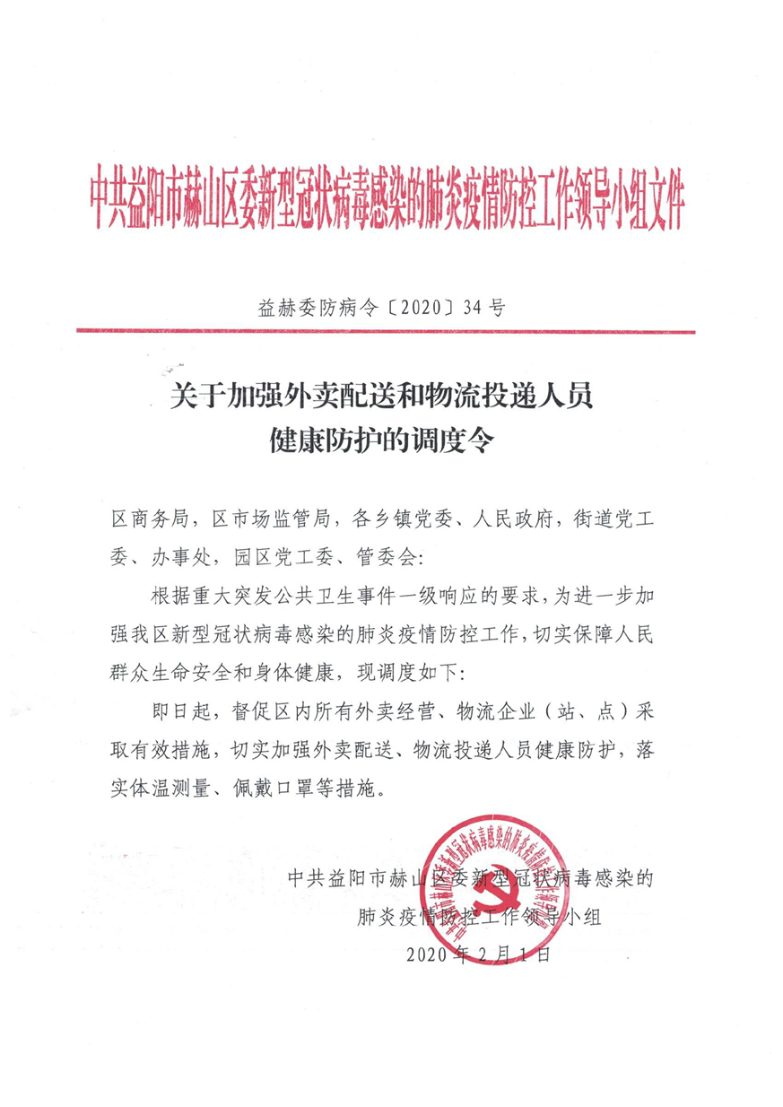 关于加强外卖配送和物流投递人员健康防护的调度令