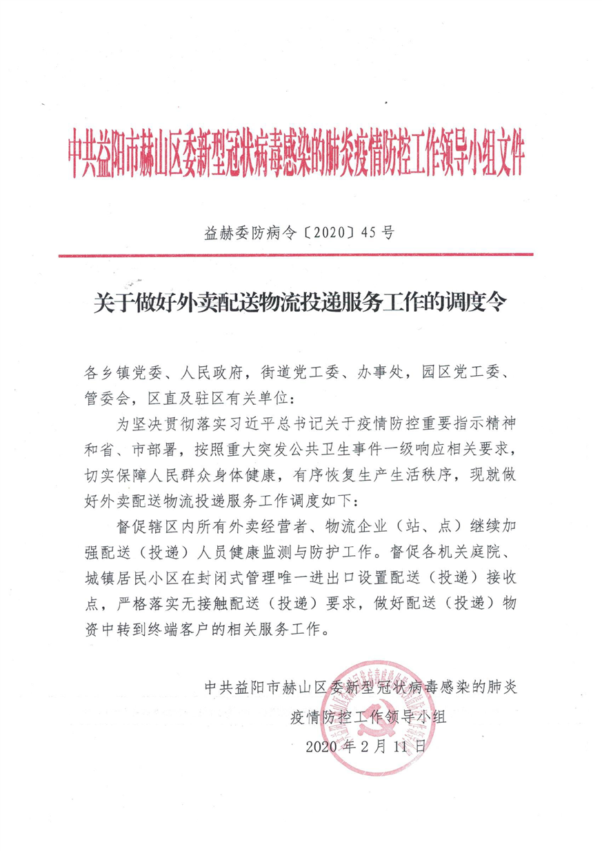 关于做好外卖配送物流投递服务工作的调度令