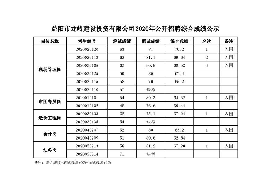 益阳市龙岭建设投资有限公司2020年公开招聘综合成绩公示