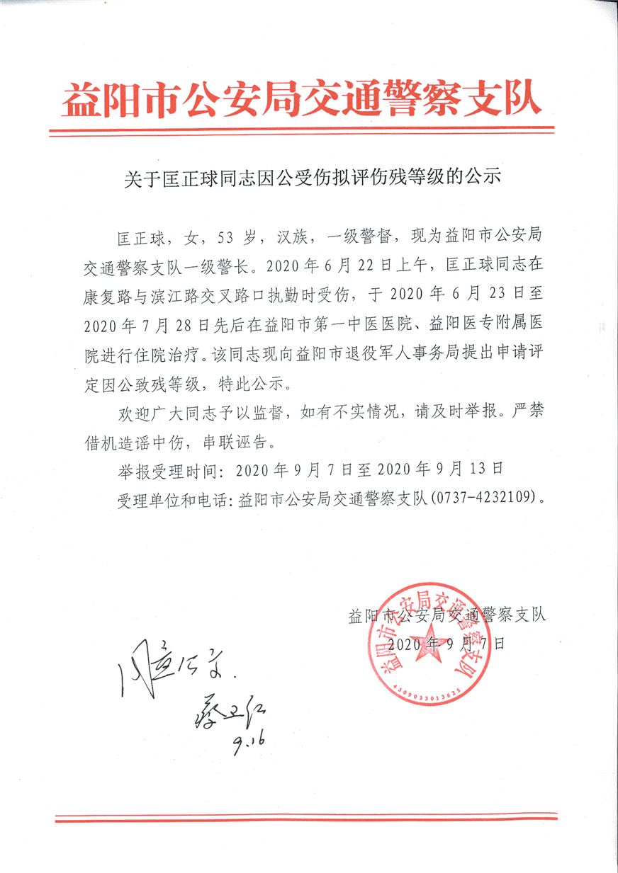 关于匡正球同志因公受伤拟评伤残等级的公示