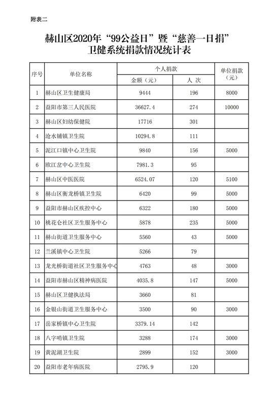 2、赫山区2020年“99公益日”暨“慈善一日捐” 卫健系统捐款情况统计表