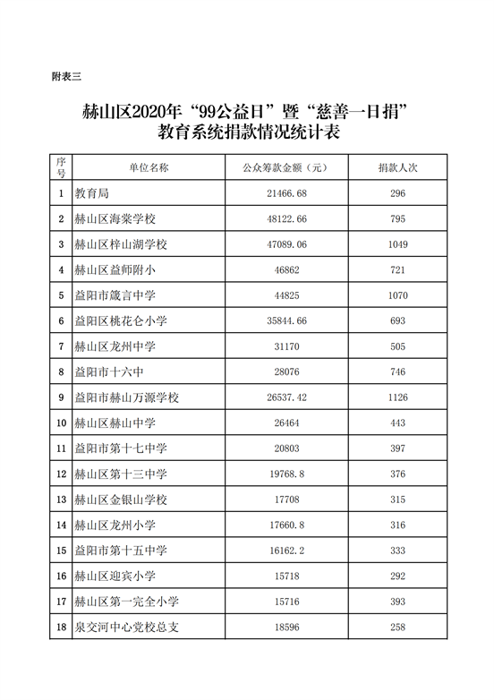 3、赫山区2020年“99公益日”暨“慈善一日捐” 教育系统捐款情况统计表