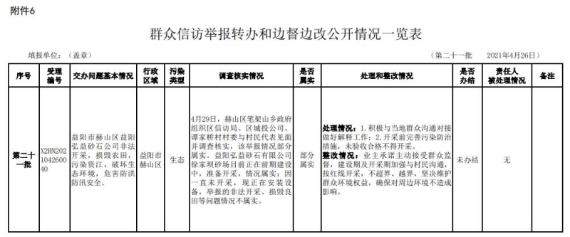 益阳弘益砂石有限公司的挖砂问题,经有关部门调查核实,正在整改中,现公示如下: