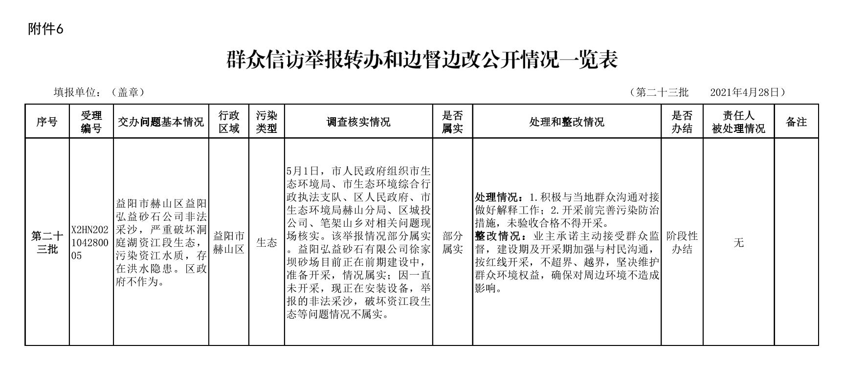 有关益阳弘益砂石公司非法采沙,严重破坏洞庭湖资江段生态的相关已经处理整改,现予公示。