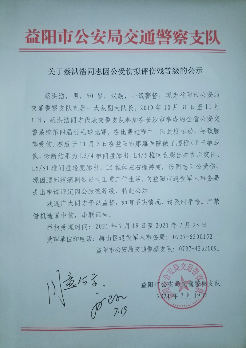 关于蔡洪浩同志因公受伤拟评伤残等级的公示