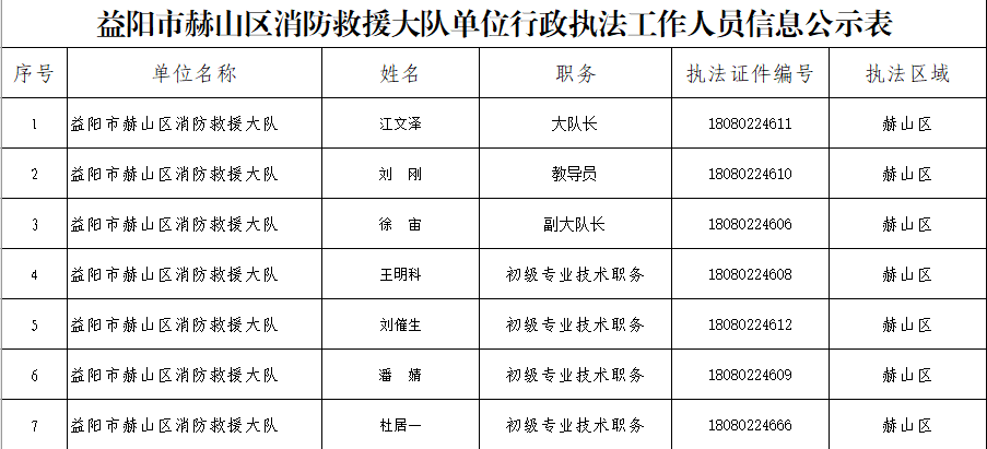 益阳市赫山区消防救援大队单位行政执法工作人员信息公示表