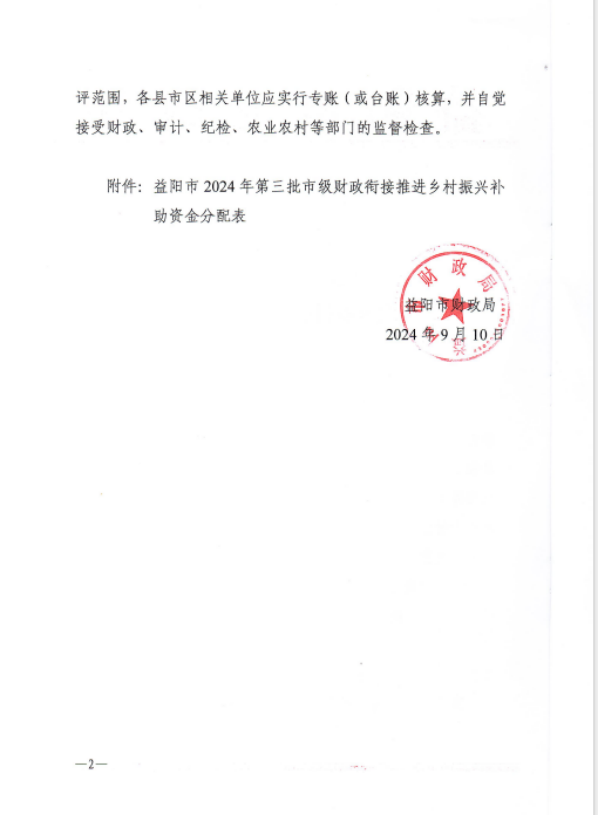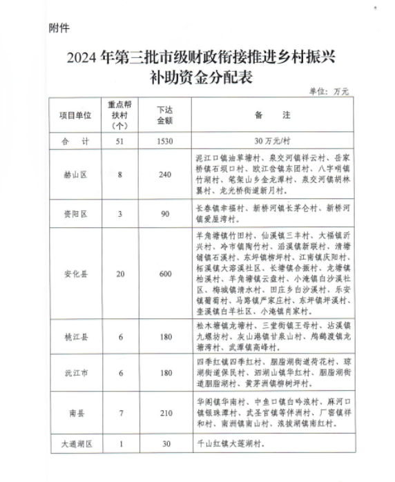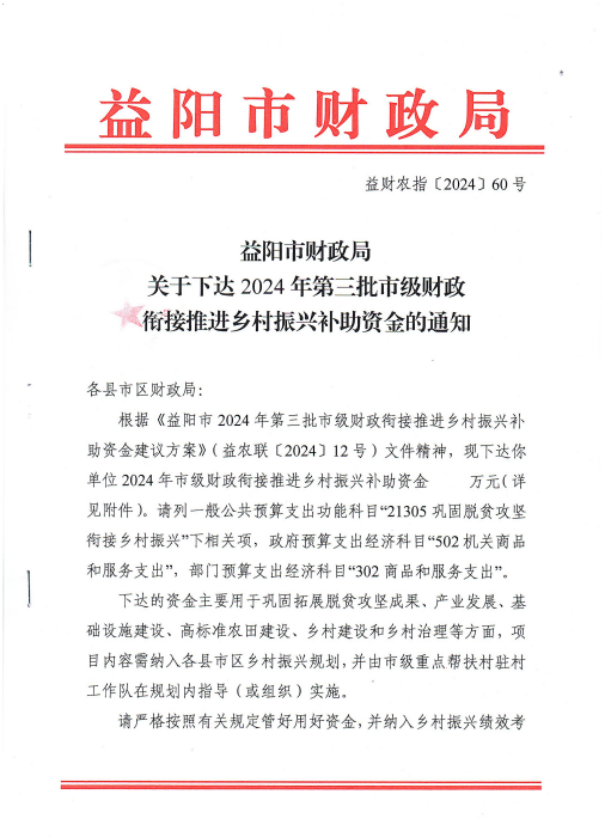 现将《益阳市财政局关于下达2024年第三批市级财政衔接推进乡村振兴补助资金的通知》转发给你们,请你们严格按照文件要求,抓紧组织实施,并严格专款专用,自觉接受农业农村、财政、审计和纪检监察等部门的监督,确保市级财政衔接推进乡村振兴补助资金充分发挥效益。