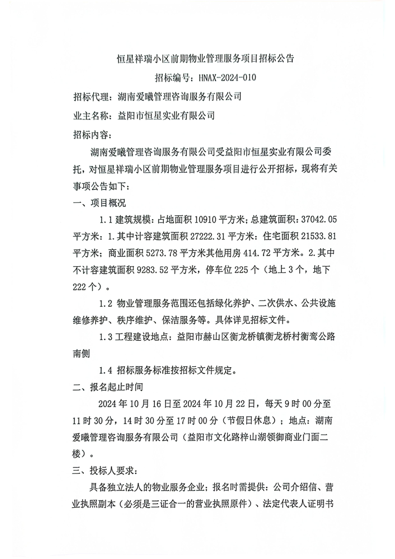 恒星祥瑞小区前期物业管理服务项目招标公告
