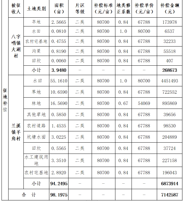 拟征收土地的总面积6.5465公顷,其中水田3.6828公顷、旱地0.8817公顷、乔木林地0.2992公顷、灌木林地0.2999公顷、其他林地0.5055、其他草地0.039公顷、坑塘水面0.2015公顷、沟渠0.0546公顷、田坎0.0375公顷、农村宅基地0.2245公顷、水工建设用地0.2234公顷、农村道路0.0969公顷。