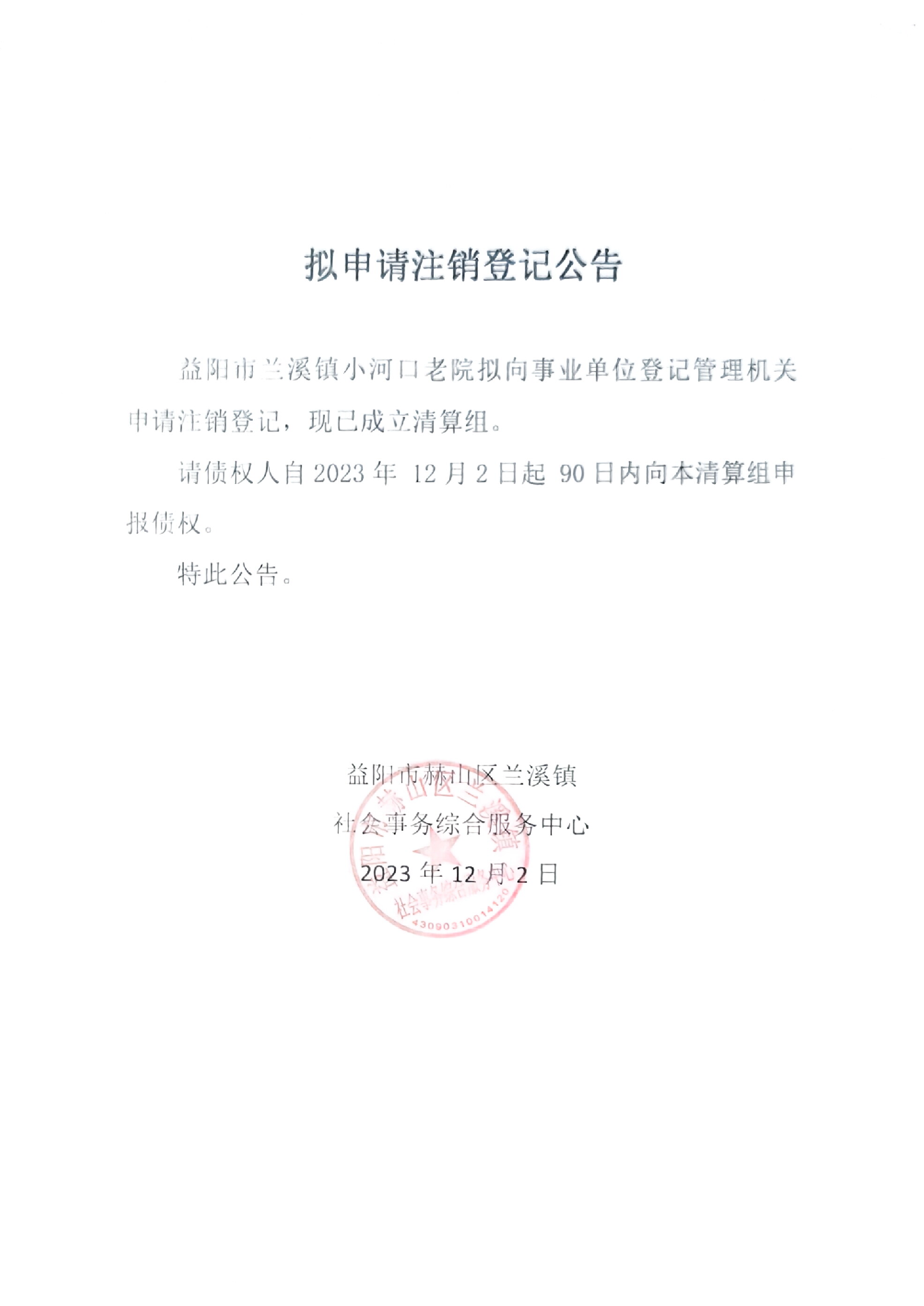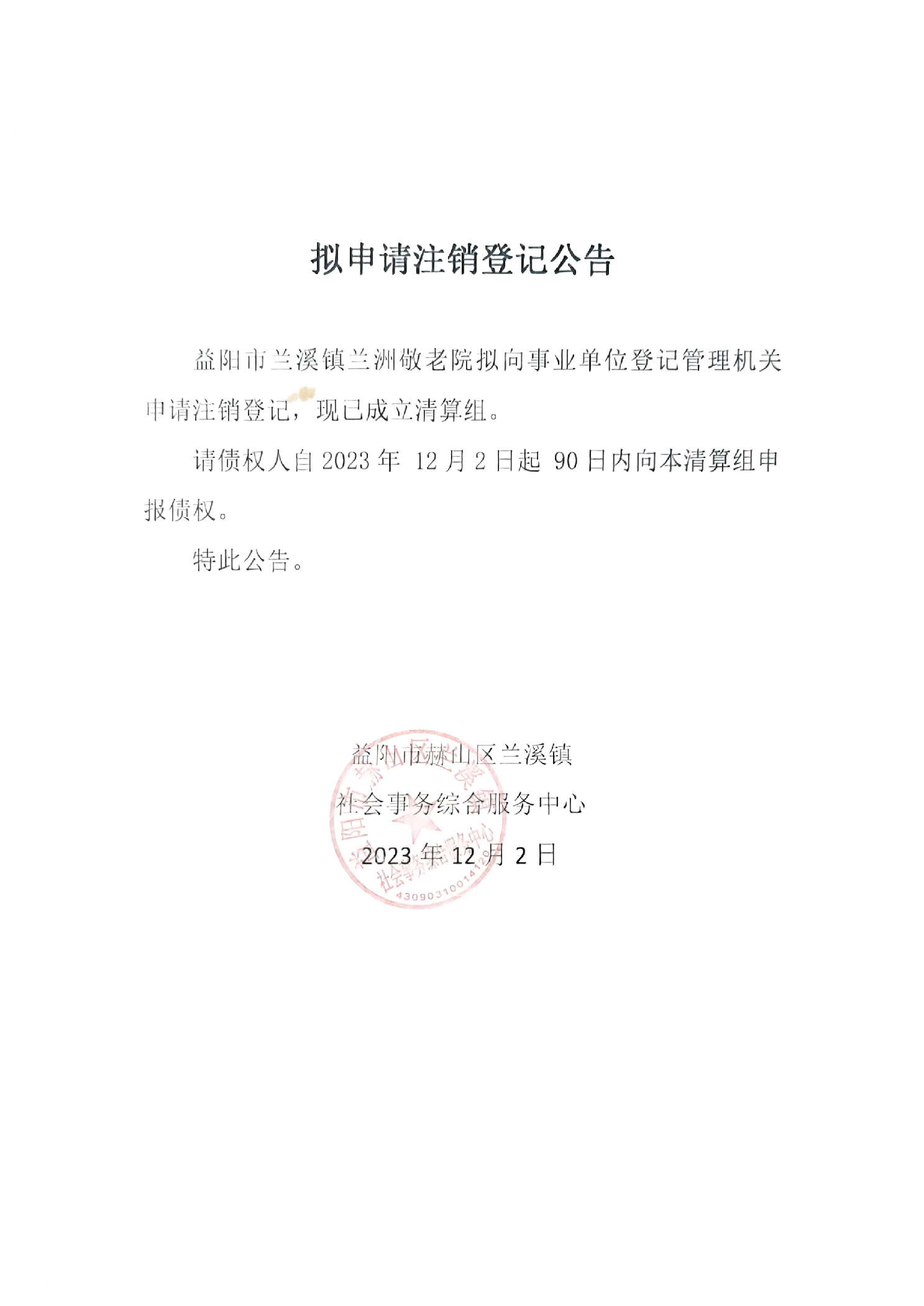 兰溪镇兰洲敬老院、小河口敬老院拟申请注销登记公告