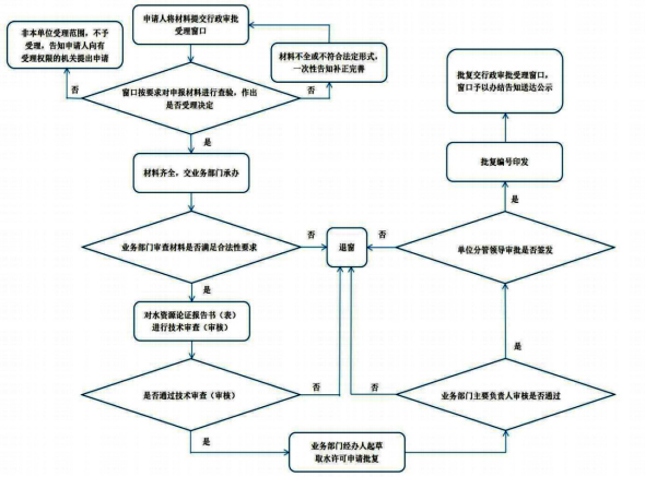 取水许可审批程序包括:申请、受理、技术审查、许可决定、送达。详见流程图:
