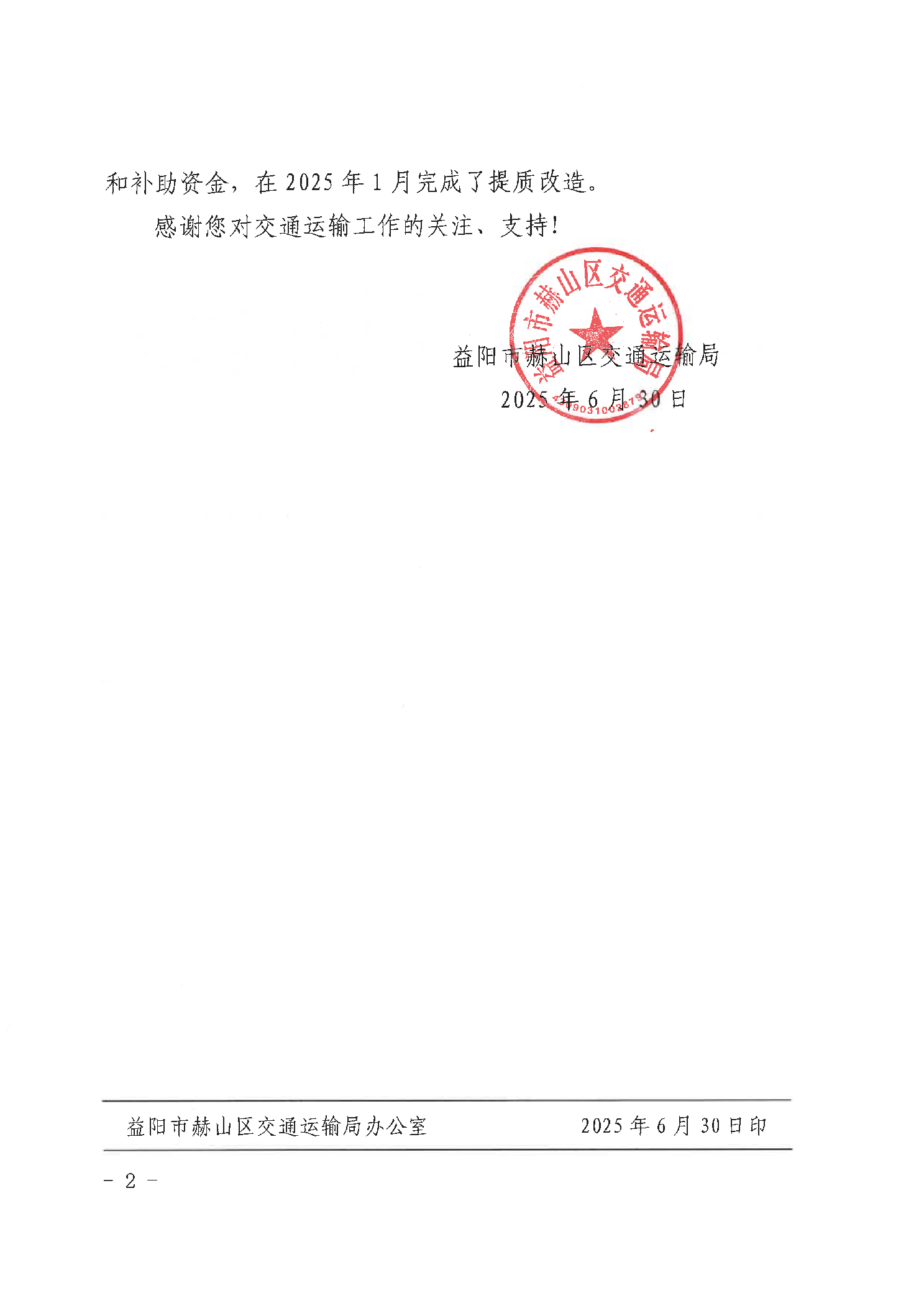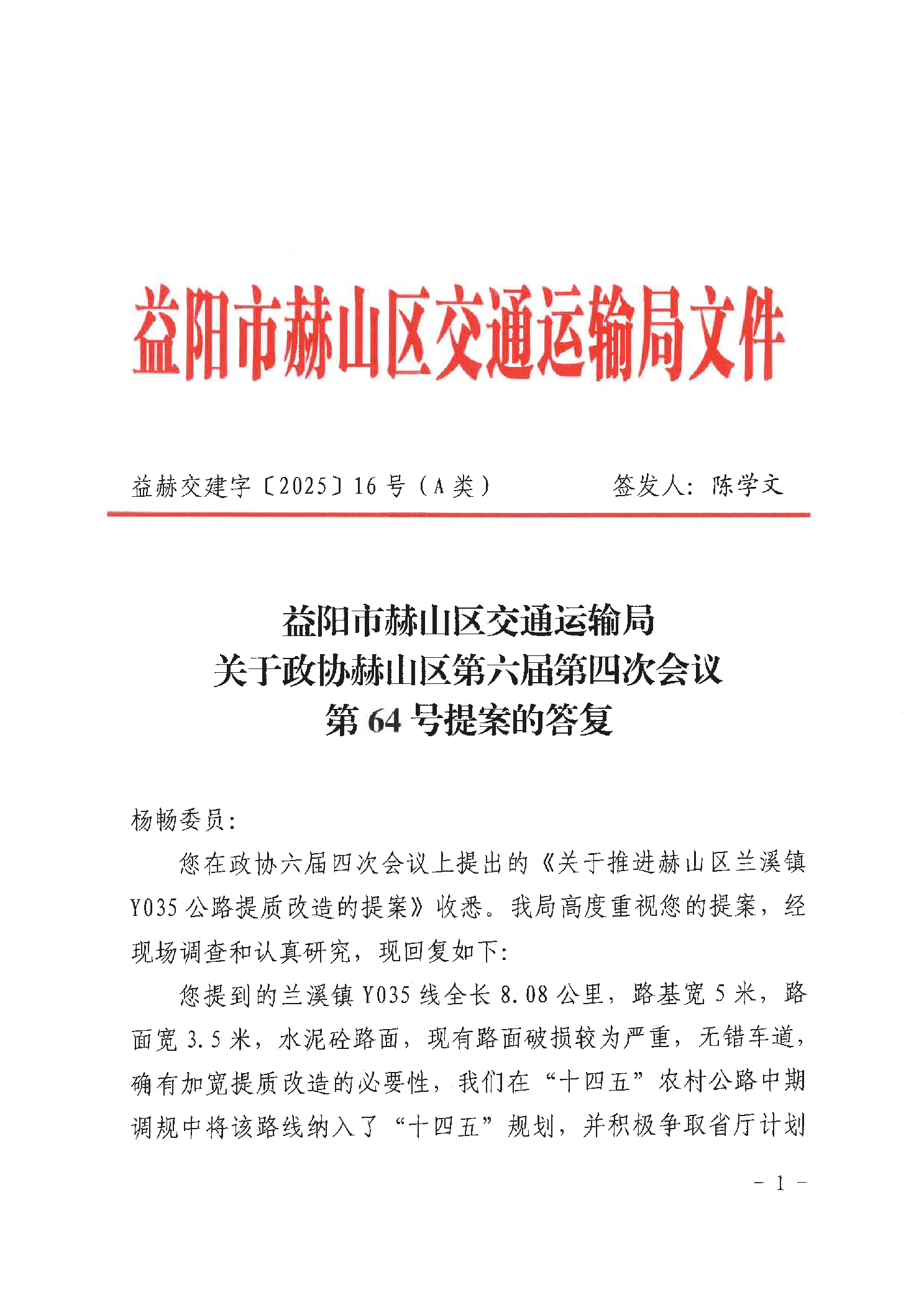 益阳市赫山区交通运输局关于政协赫山区第六届第四次会议第64号提案的答复(2025)