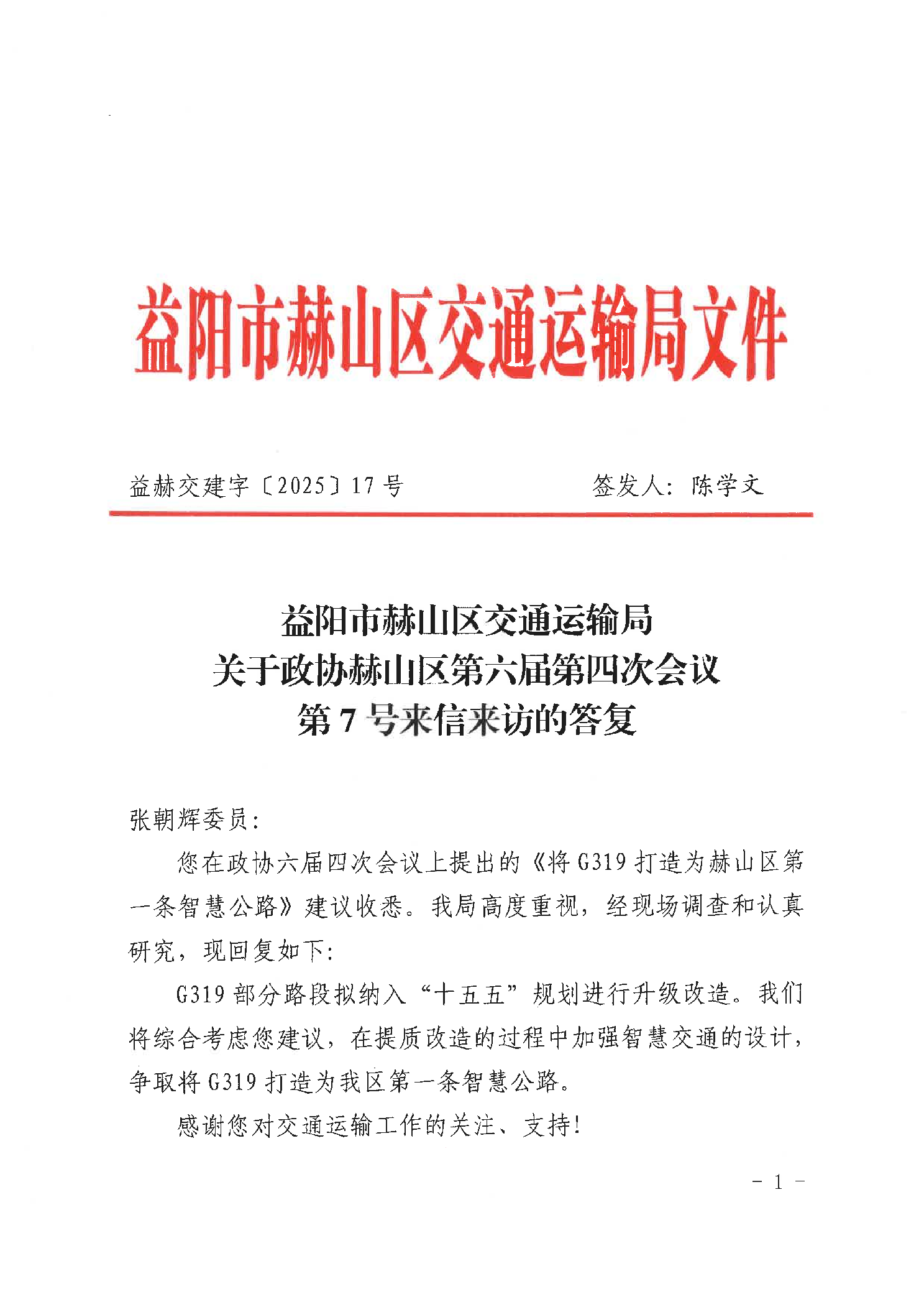 益阳市赫山区交通运输局关于政协赫山区第六届第四次会议第7号来信来访的答复(2025)