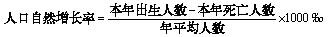 人口自然增长率 指在一定时期内(通常为一年)人口自然增加数(出生人数减死亡人数)与该时期内平均人数(或期中人数)之比,用千分率表示。计算公式为: